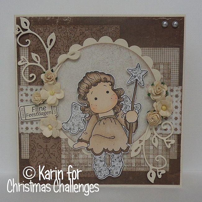 Marion met Judi en Rob from Judi Kins personally on the Art Specially event. They had a good talk and Marion invited them as sponsors to our blog. They were happy to be our sponsor. At the end of the Event Marion got a bag with some of Judi's stamps and told Marion that she could use the stamps for the challenge blog and give them away to the winner, but not all at the same challenge ;o) The stamps are pretty unique because Judi used them herself on the Art Event. So they came with a little paint on them and her fingerprints. Hope you all don't mind and enjoy the kind gesture they gave us! For this challenge you can win the second stamp from that bag. Which one? That remains a surprise...